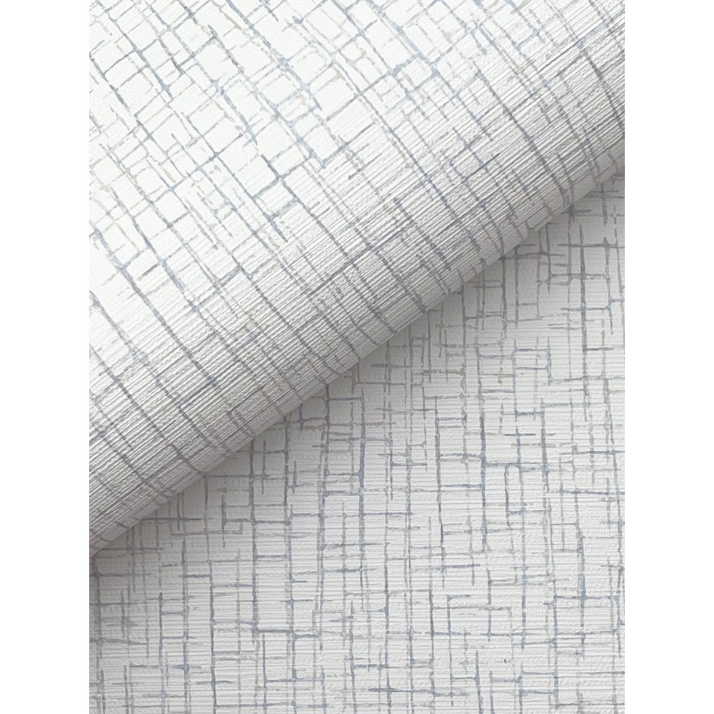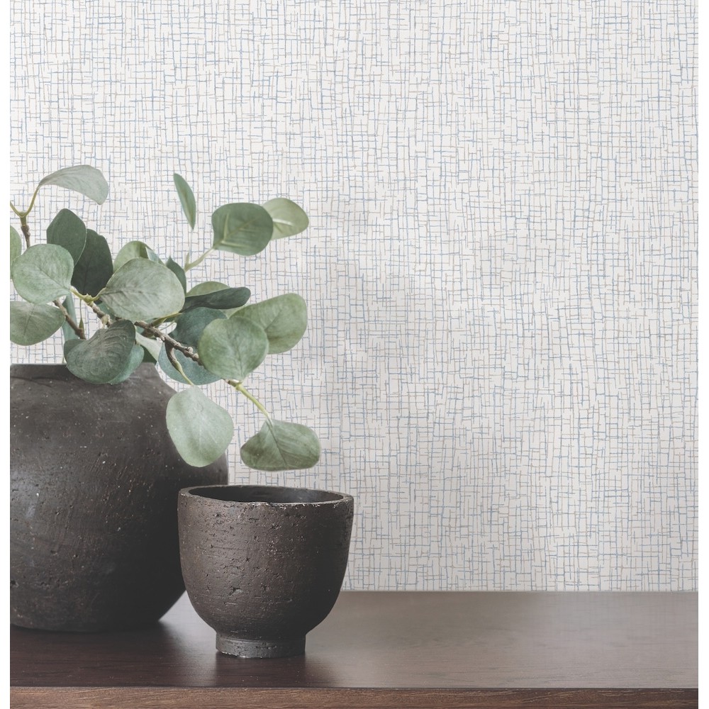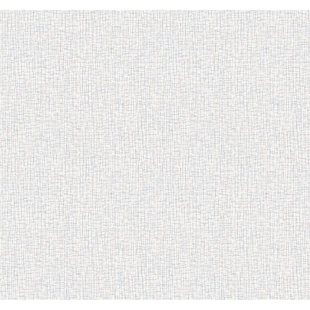 Several layers of abstract, maze-like grids overlap to create simple intrigue in pattern Aden. Seen here with pale blue and beige linework against white.
