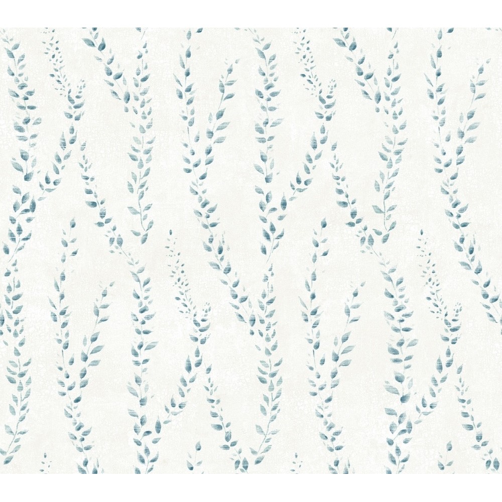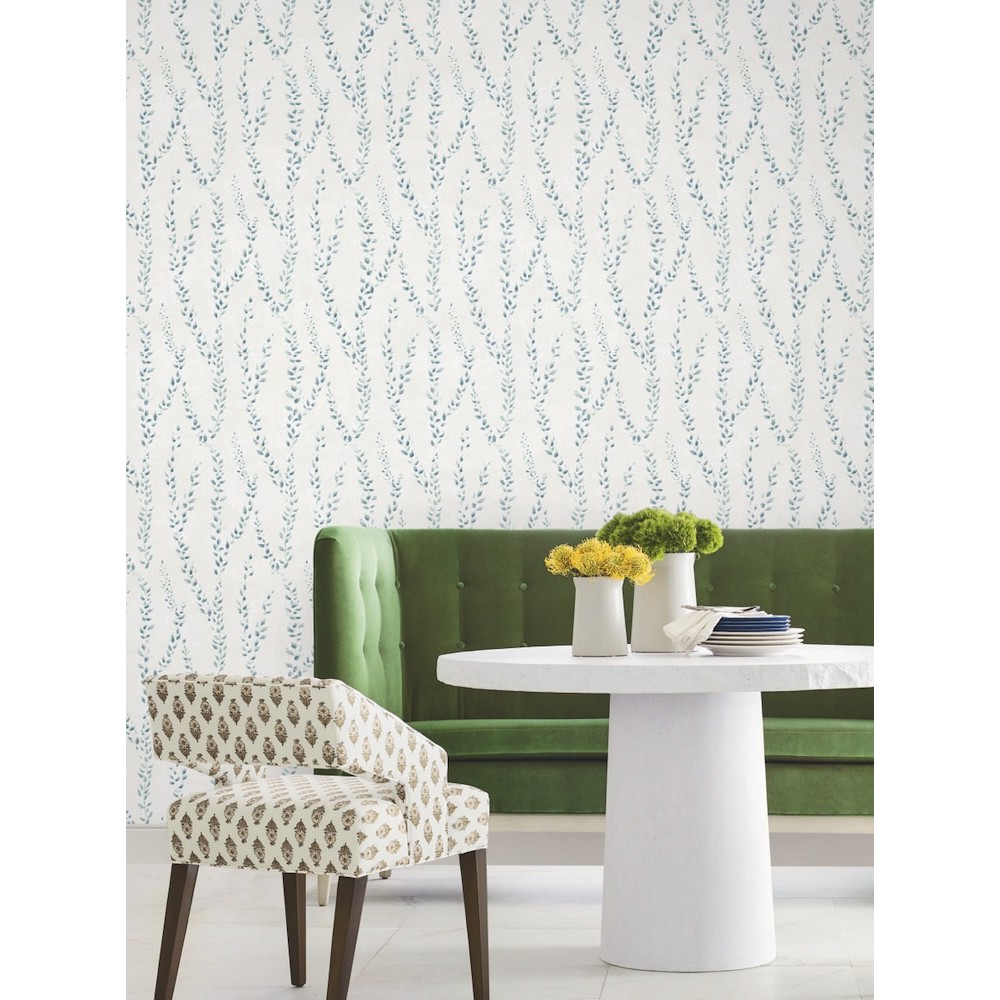 Thin vines with dainty, pointed leaves climb upwards along a weathered backdrop in pattern Alpenrose. Seen here in rich blue against off white. Alpenrose is an unpasted, non woven wallpaper measuring 27 inches wide by 27 feet long, covering approximately 60.8 square feet per roll.