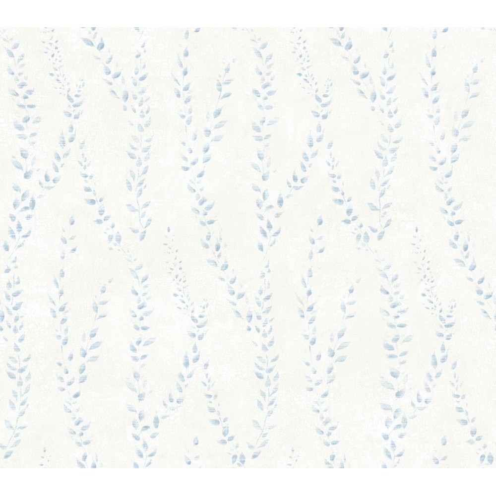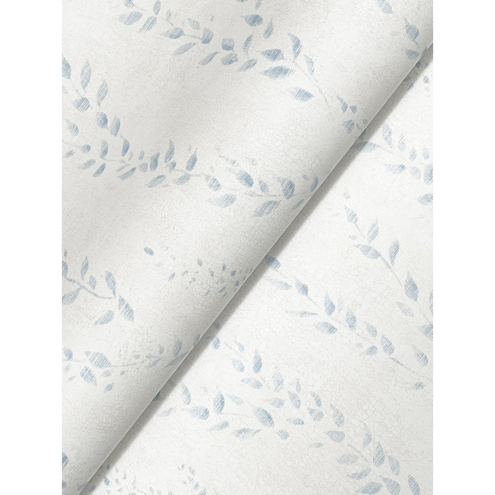 Thin vines with dainty, pointed leaves climb upwards along a weathered backdrop in pattern Alpenrose. Seen here in soft blue against off-white. Alpenrose is an unpasted, non woven wallpaper measuring 27 inches wide by 27 feet long, covering approximately 60.8 square feet per roll.