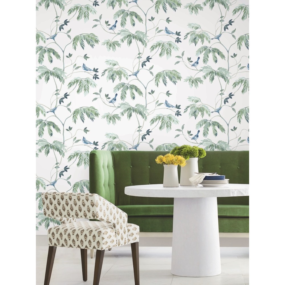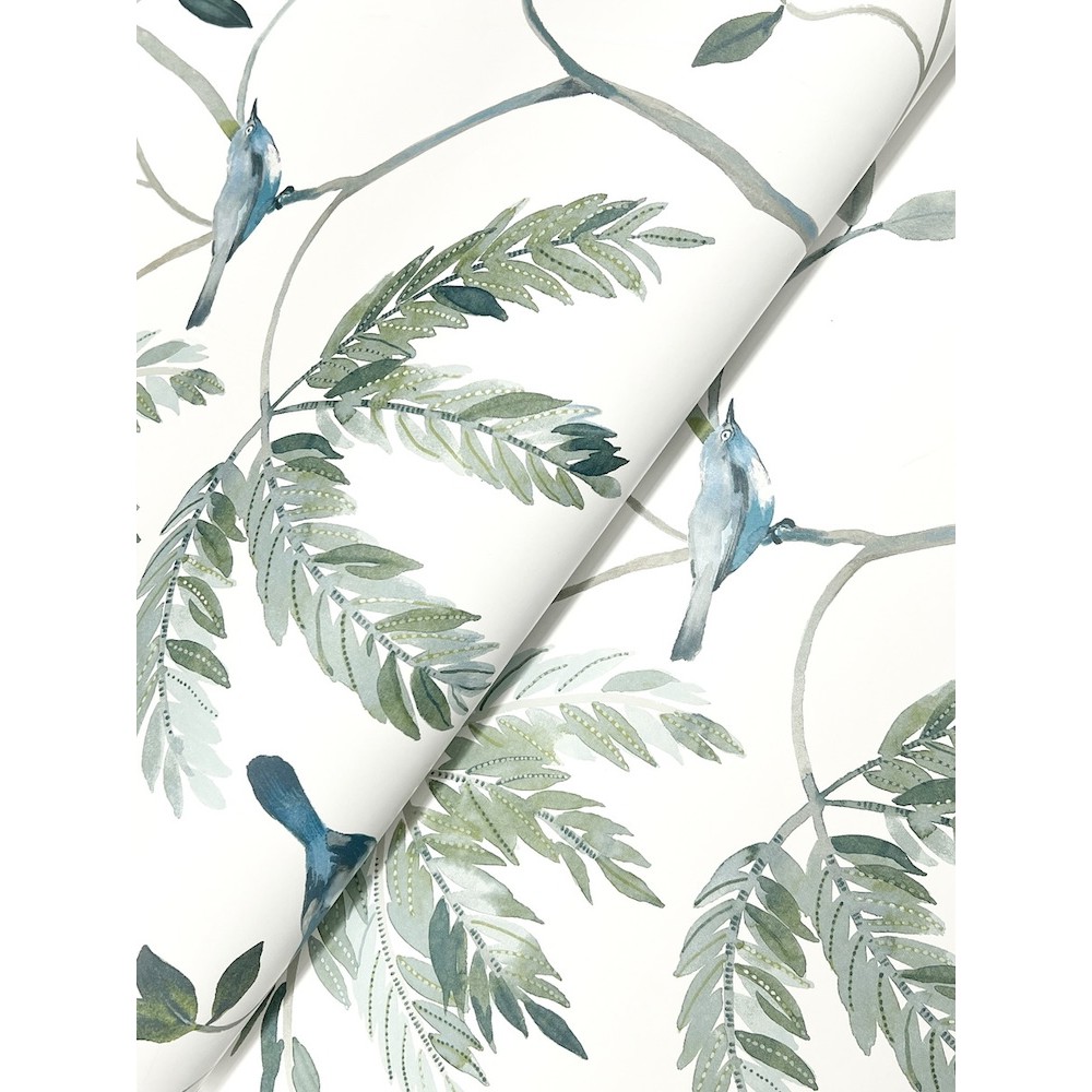 Curious birds perch along spindly saplings, the backdrop's antique and weathered texture giving pattern Cillian depth and comfort. Featured here in shades of blue, teal, green, and taupe against ivory. Cillian is an unpasted, non woven wallpaper measuring 27 inches wide by 27 feet long, covering approximately 60.8 square feet per roll.