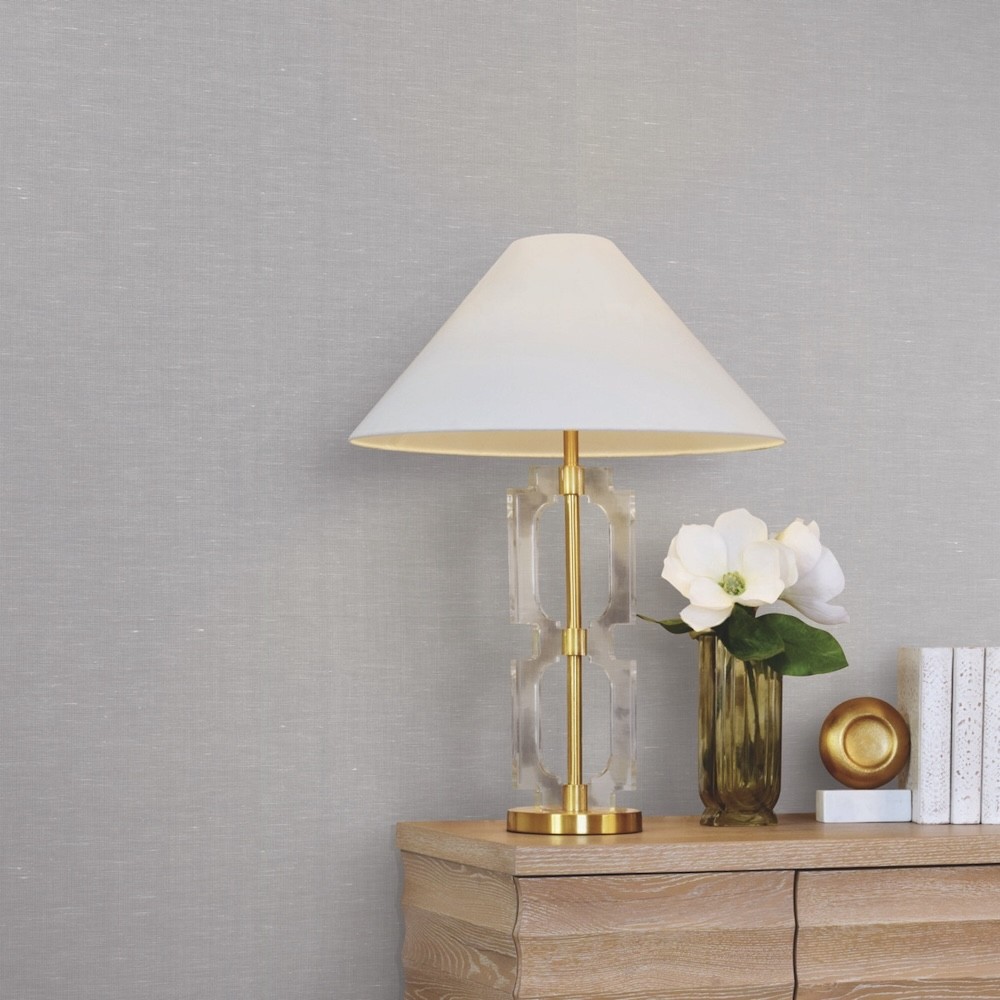 Thin strands of yarn loomed from fibrous hemp are woven into a delicate netting in pattern Hempfield Weave. The white threads are offset against a silver-grey backdrop. Hempfield Weave is an unpasted, cotton and hemp on non woven wallpaper measuring 36 inches wide by 24 feet long, covering approximately 72 square feet per roll.