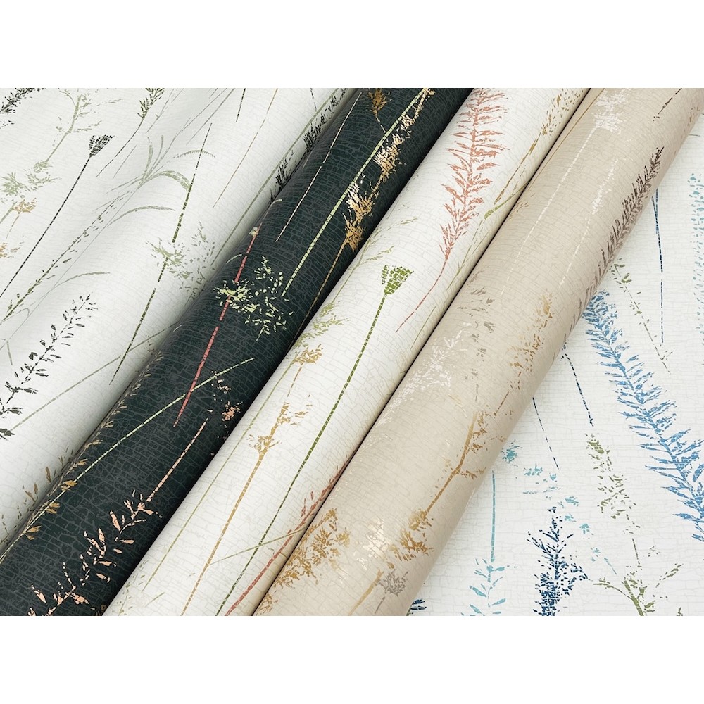 Silhouettes of various prairie grasses are laid along a weathered backdrop in design Meadow Splendor. The botanicals are inked in shades of blue and green along a cream background. Meadow Splendor is an unpasted, non woven wallpaper measuring 27 inches wide by 27 feet long, covering approximately 60.8 square feet per roll.