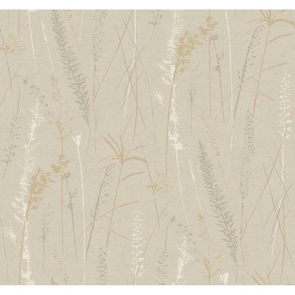 Silhouettes of various prairie grasses are laid along a weathered backdrop in design Meadow Splendor. The botanicals are inked in metallic gold, metallic pewter, and white along a taupe background. Meadow Splendor is an unpasted, non woven wallpaper measuring 27 inches wide by 27 feet long, covering approximately 60.8 square feet per roll.