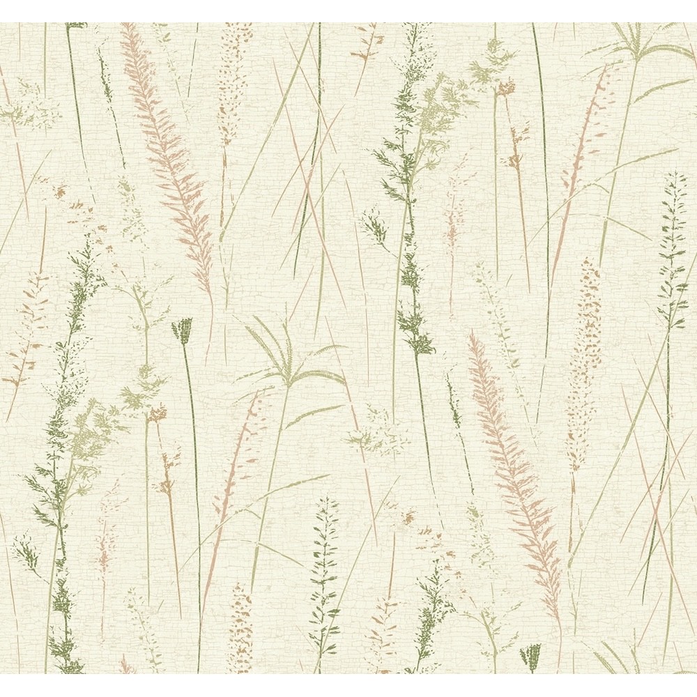 Silhouettes of various prairie grasses are laid along a weathered backdrop in design Meadow Splendor. The botanicals are inked in light and dark green, salmon, and ochre along a cream background. Meadow Splendor is an unpasted, non woven wallpaper measuring 27 inches wide by 27 feet long, covering approximately 60.8 square feet per roll.
