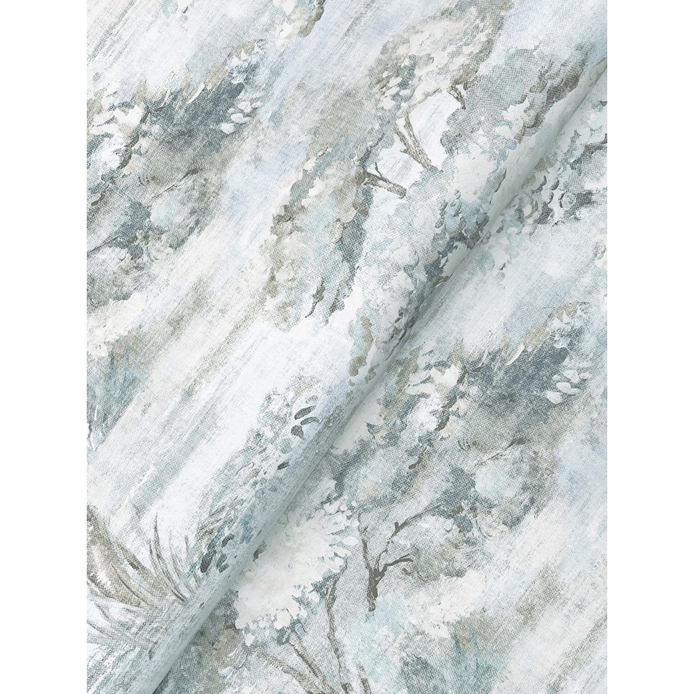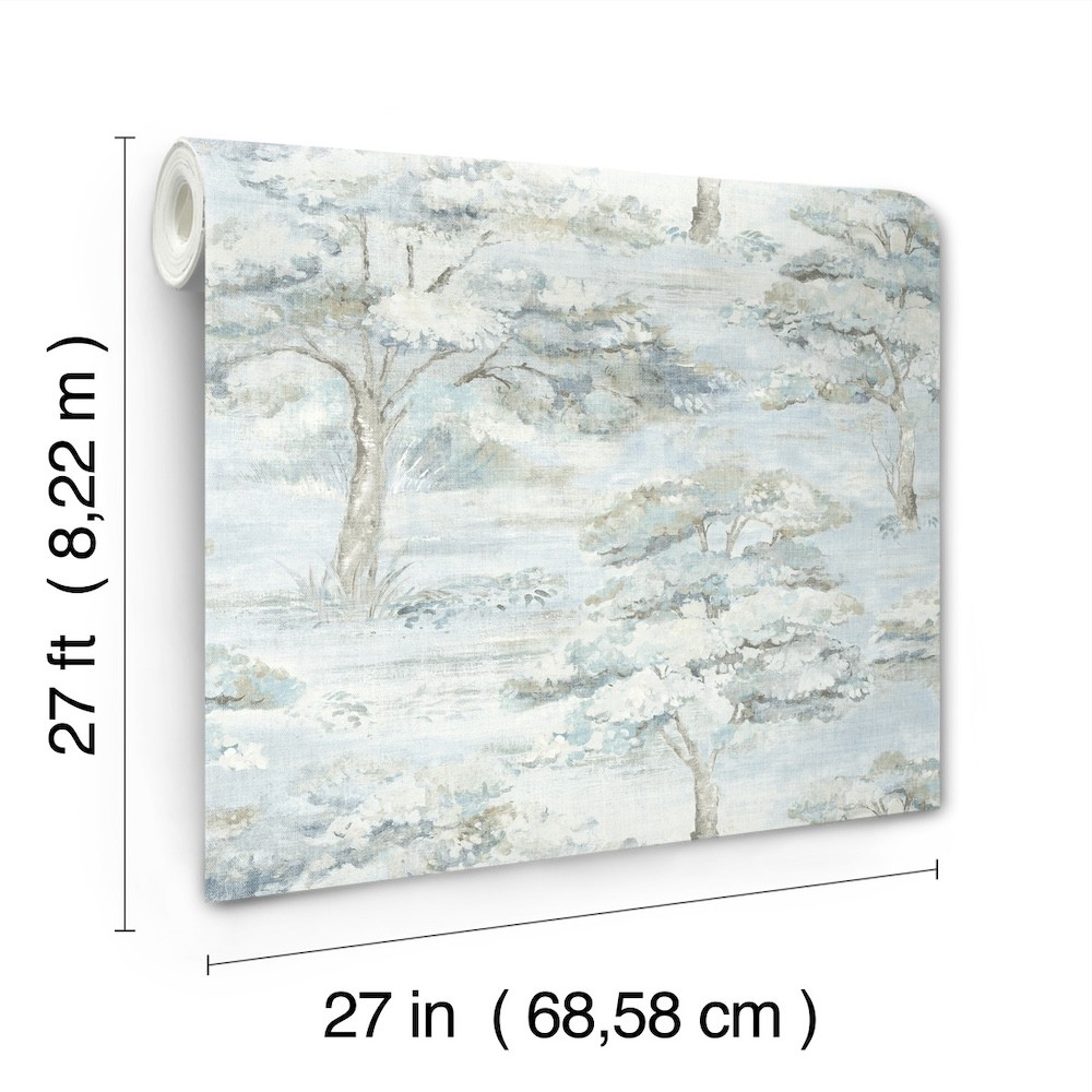 Textural detailing gives Moreno's scenic woodland design the look of a woven tapestry. Seen here in a palette of varied blues, taupe, grey, brown, and white. Moreno is an unpasted, non woven wallpaper measuring 27 inches wide by 27 feet long, covering approximately 60.8 square feet per roll.
