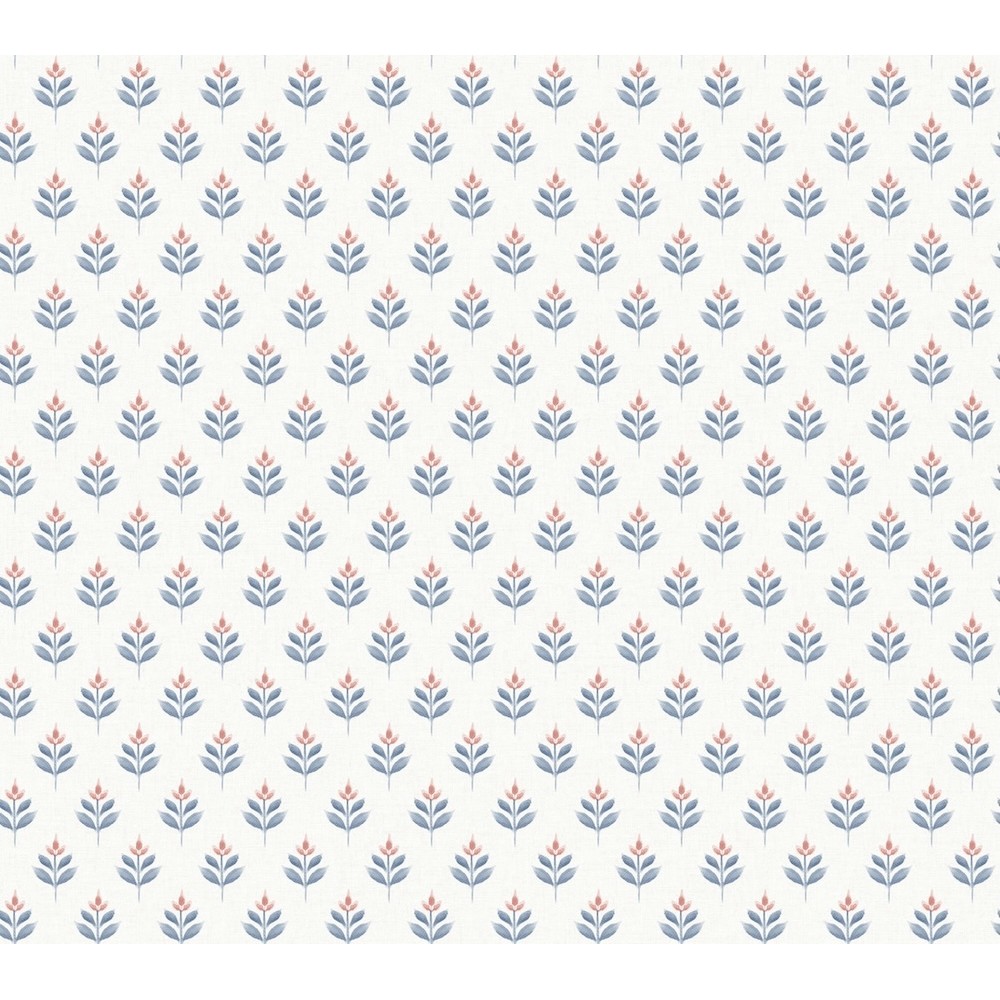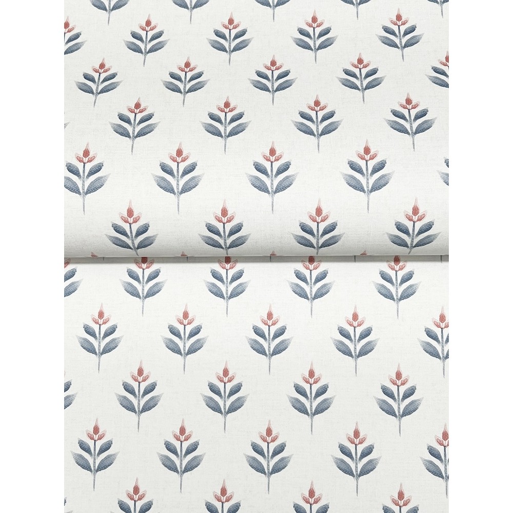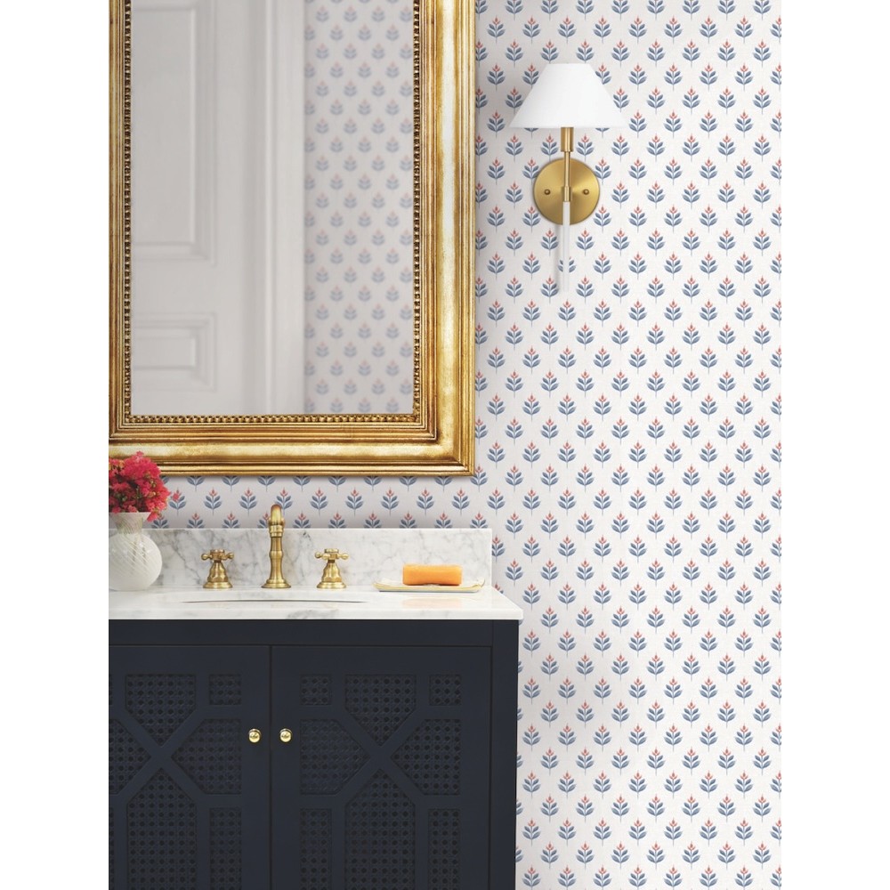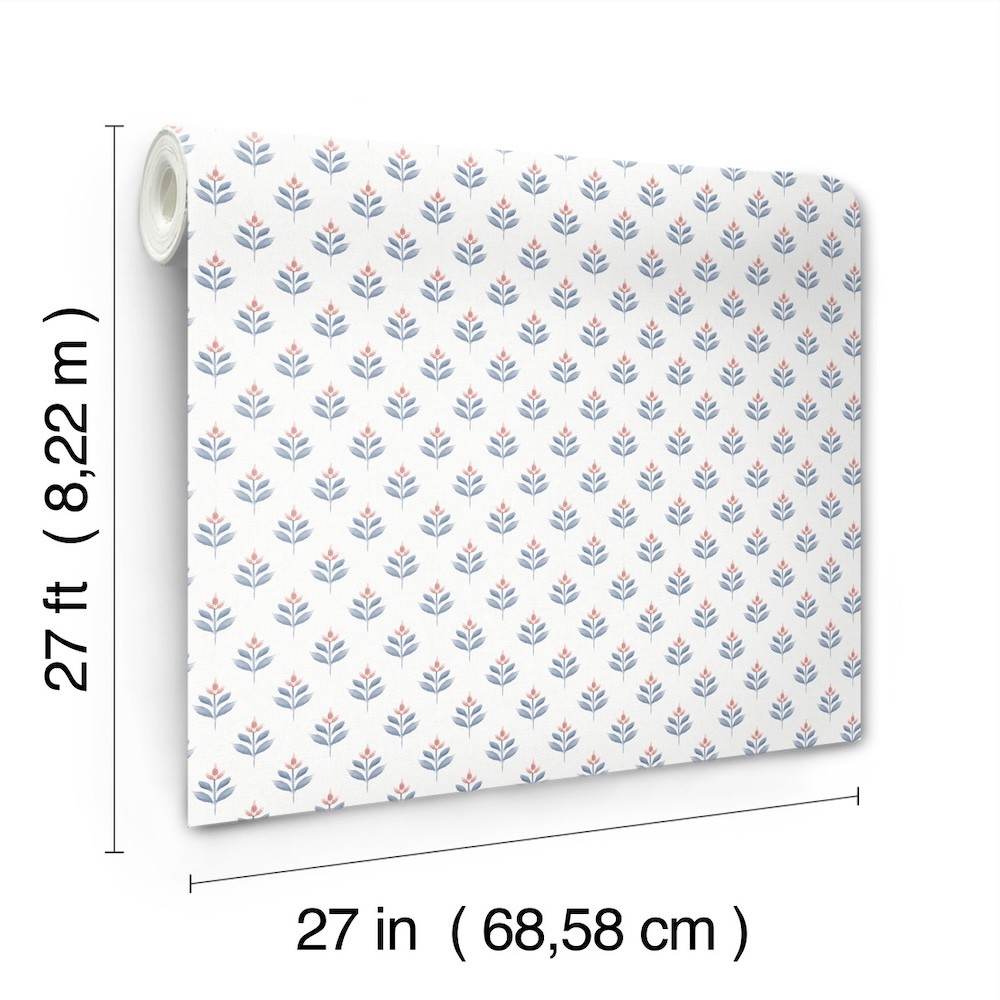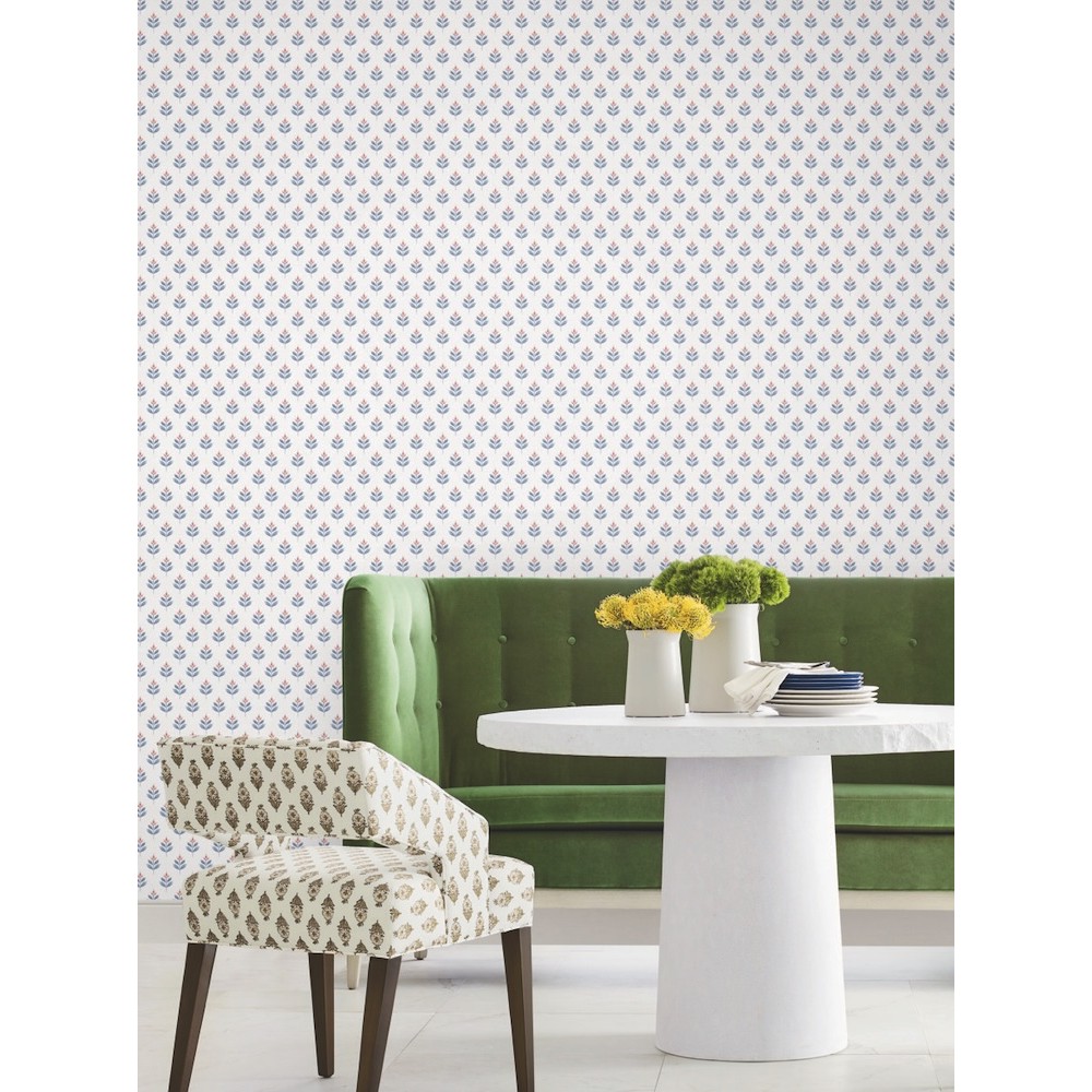 Dainty, abstract tulips are stamped in offset rows along a backdrop imbued with linen detailing in pattern Serene Villa. Seen here in red and indigo against white. Serene Villa is an unpasted, non woven wallpaper measuring 27 inches wide by 27 feet long, covering approximately 60.8 square feet per roll.
