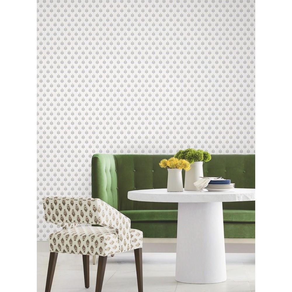 Dainty, abstract tulips are stamped in offset rows along a backdrop imbued with linen detailing in pattern Serene Villa. Seen here in taupe and grey against white. Serene Villa is an unpasted, non woven wallpaper measuring 27 inches wide by 27 feet long, covering approximately 60.8 square feet per roll.