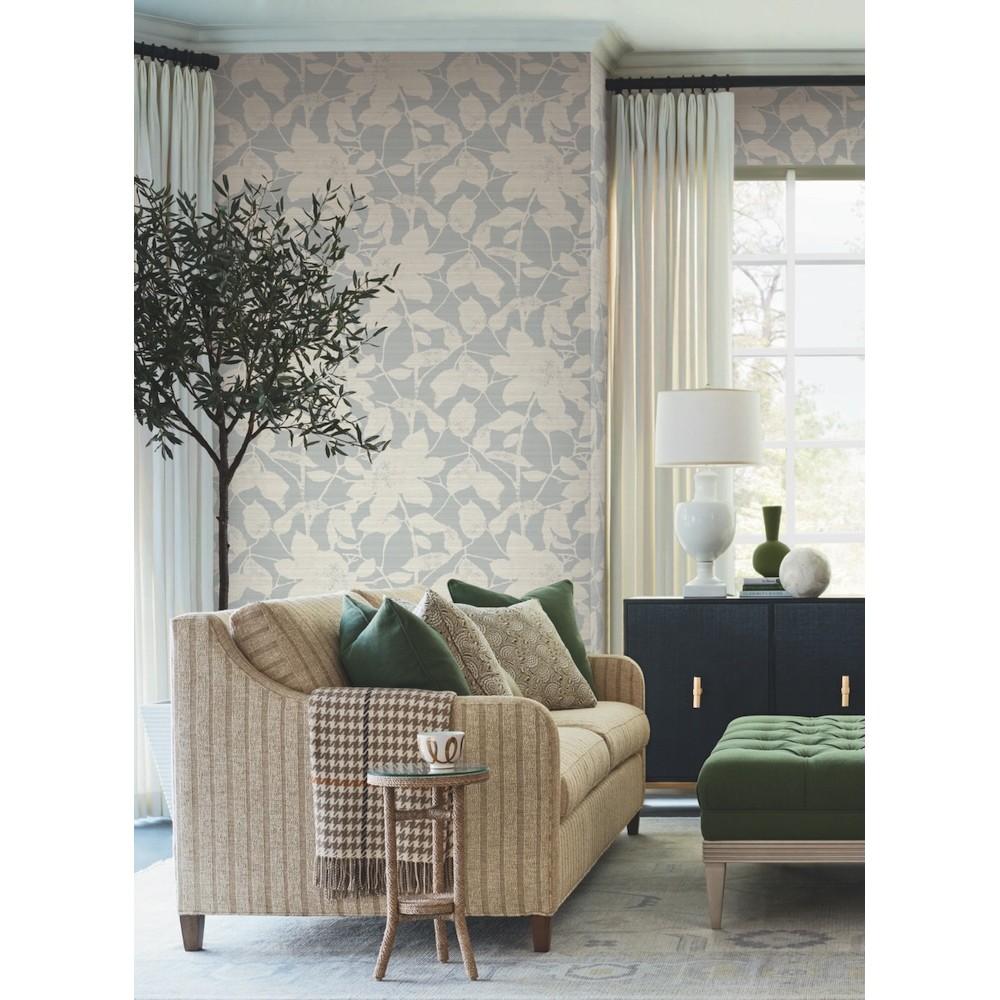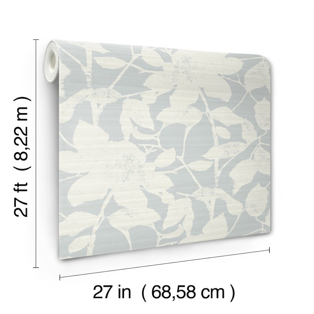 Solange's enticing silhouettes of woodland florals enjoy extra richness from their dappled overlay along a softly striated backdrop. Seen here inked in pale grey against light blue. Solange is an unpasted, non woven wallpaper measuring 27 inches wide by 27 feet long, covering approximately 60.8 square feet per roll.