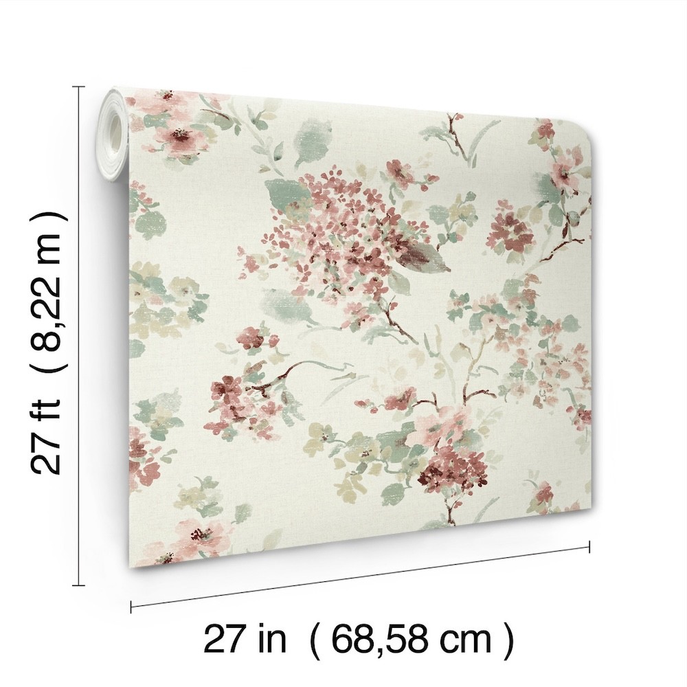 A medley of summertime blooms climb towards the sun in charming Veiled Garden. The flowers are inked in rosy red, pink, mint, pale green, beige, and merlot along a dove backdrop imbued with linen detailing. Veiled Garden is an unpasted, non woven wallpaper measuring 27 inches wide by 27 feet long, covering approximately 60.8 square feet per roll.
