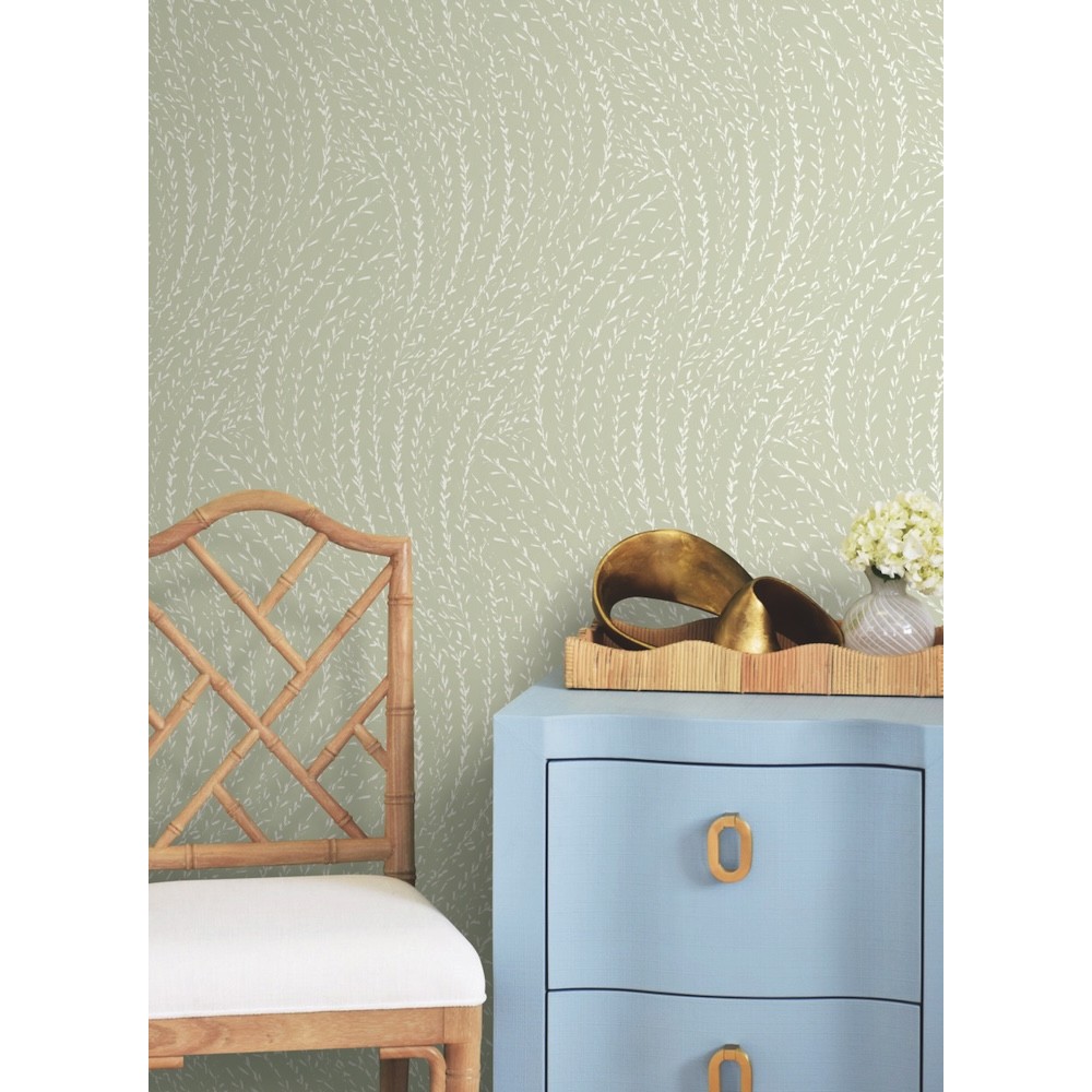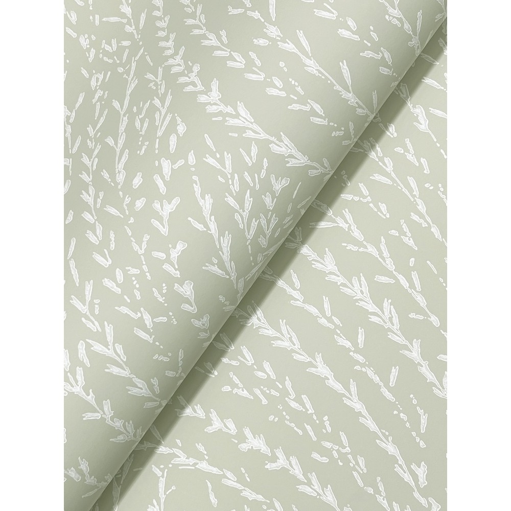 Willow Song's slender branches bedecked in short, pointed leaves twist and sway in an invisible breeze. The botanicals are inked in white along a sage background. Willow Song is an unpasted, non woven wallpaper measuring 27 inches wide by 27 feet long, covering approximately 60.8 square feet per roll.